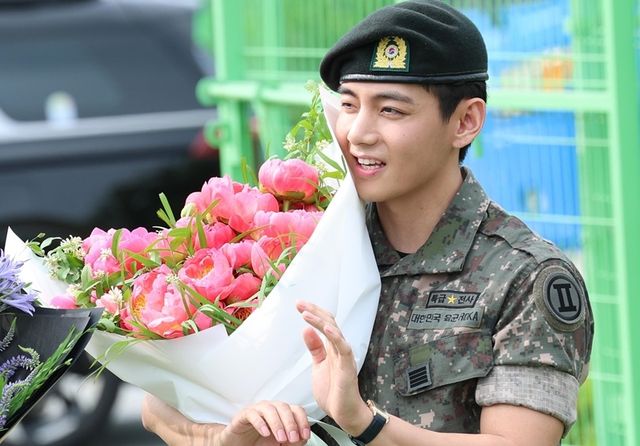 꽃다발을 받으며 전역하는 뷔 / 뉴스1