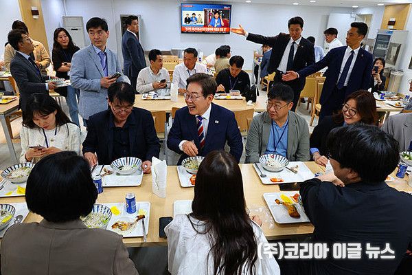 이 대통령은 식사 후 기자식당 앞에서 대기 중인 기자들과 인사를 나누고 기념사진을 촬영하는 등 친근한 모습을 보였다.