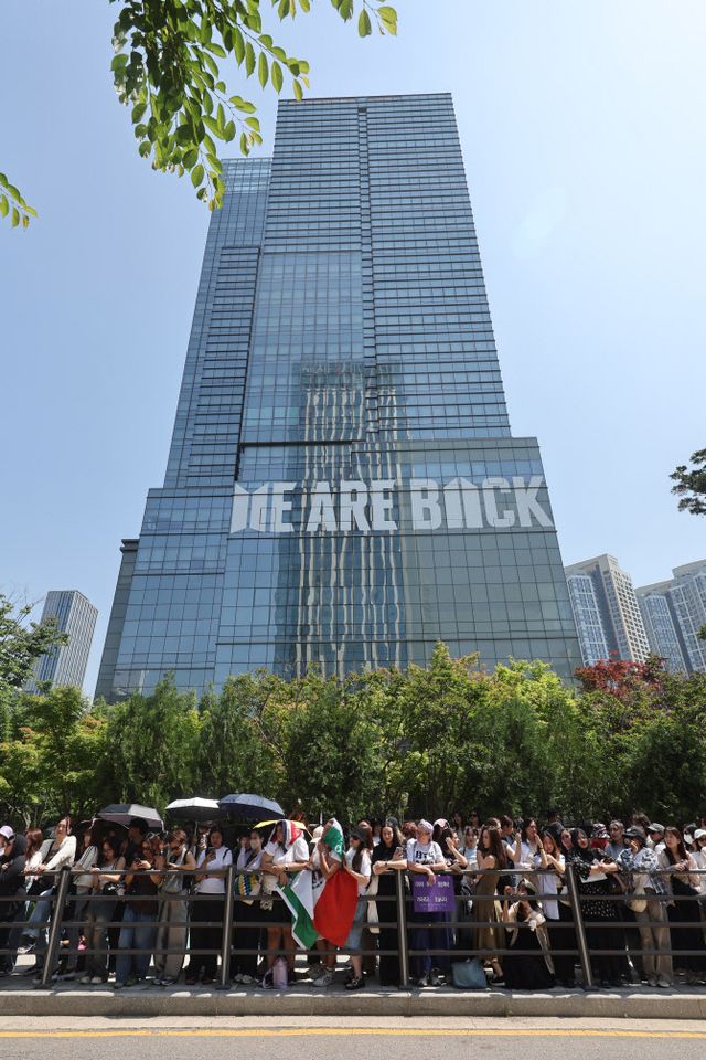 하이브 사옥 외벽에는 방탄소년단과 아미(팬덤명)의 공식 로고와 ‘위 아 백’(WE ARE BACK)이라는 문구가 래핑됐다. 해당 래핑은 오는 29일까지 유지될 예정이다.