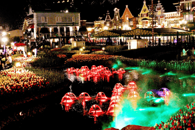 에버랜드의 밤은 낮보다 더욱 아름답고 특별합니다. 수많은 불빛으로 장식된 놀이기구들과 정원은 그 자체로 화려한 풍경을 선사하며, 특히 겨울철 조명 축제가 열리는 시기에는 낭만적인 분위기를 한껏 즐길 수 있습니다.