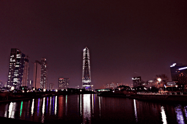 송도센트럴파크는 한겨울 추위 속에서도 따뜻한 불빛들로 가득합니다. 높다란 빌딩과 넓은 공원 사이를 수놓는 조명은 마치 영화의 한 장면처럼 멋진 풍경을 연출합니다. 물 위로 반사되는 빛은 도시의 화려함과 자연의 고요를 동시에 느끼게 합니다.