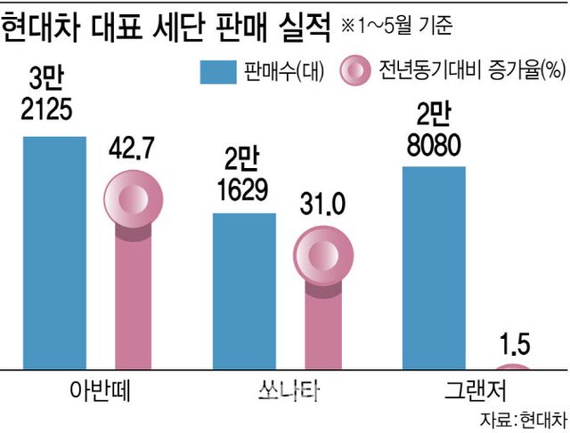 2분기 들어 경기 불확실성 증대와 내수침체에 내수 판매량이 줄어드는 가운데서도 세단 판매량은 늘어나는 모습을 보이기도 했다. 올 1~5월 누계 기준으로 아반떼 판매량은 전년 대비 42.7% 증가한 3만2125대, 쏘나타는 31.0% 늘어난 2만1629대를 팔았다. 그랜저는 1.5% 증가한 2만8080대를 기록했다.