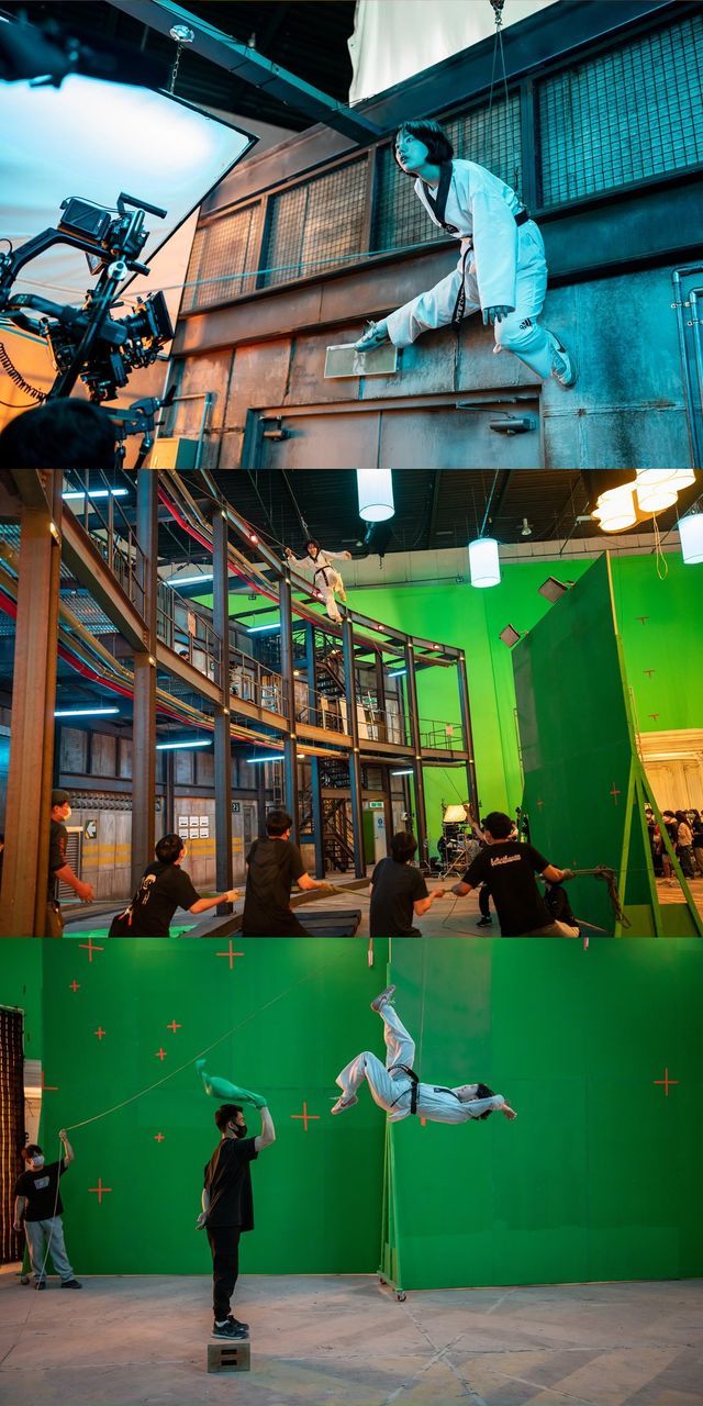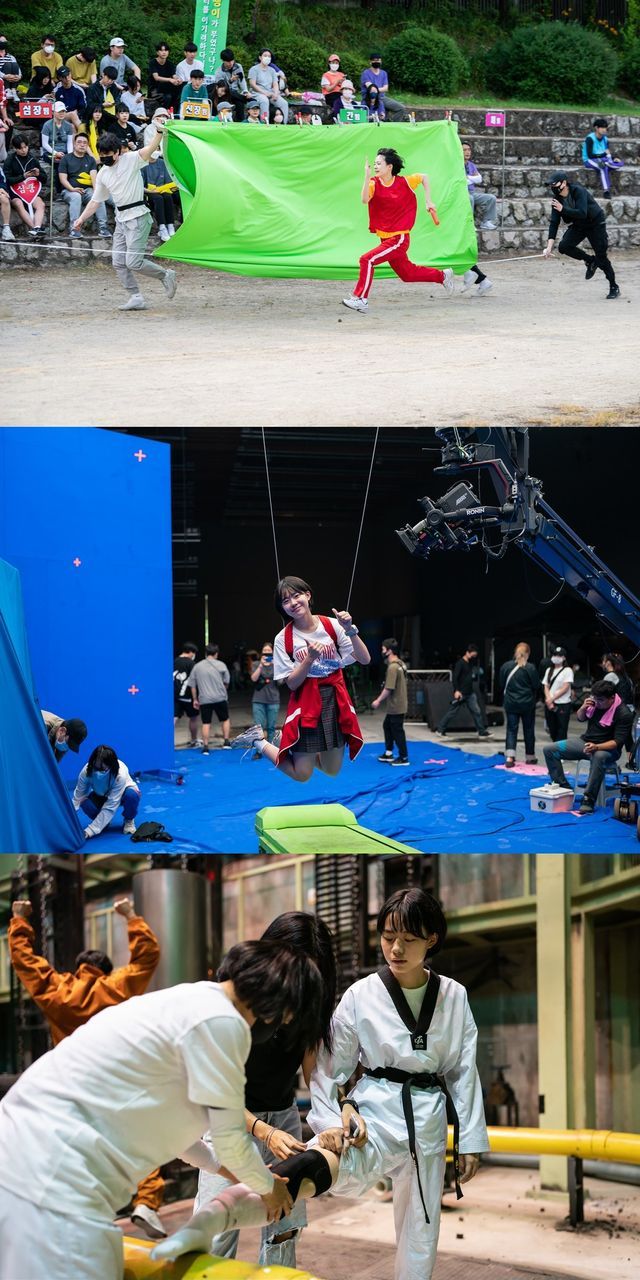 이번에 공개된 스틸은 심장이식 후 스피드와 괴력을 얻게 된 태권소녀 ‘완서’ 역으로 맹활약하며 액션의 진수를 선보인 이재인의 촬영 현장 비하인드가 생생하게 담겨 있어 눈길을 끈다. 전력을 다해 그린 매트를 배경으로 수차례 달리는 장면부터 와이어에만 의존한 채 공중 돌기를 하고 ‘영춘’(박진영)과의 대결을 위해 합을 맞추는 모습까지, 스틸만으로도 고난도 액션을 소화해낸 이재인의 노력이 고스란히 느껴진다. “액션은 새로운 도전이었고 동작 하나하나에 대한 고민이 많았다” 고 전한 이재인은 프리 프로덕션부터 촬영까지 무려 10개월간 쉬지 않고 액션 트레이닝을 진행하며 태권도 품새를 비롯한 다양한 태권도 동작, 고난도 와이어 액션까지 훈련을 거듭했다.