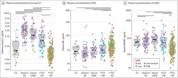 연구 결과, 사후에 측정된 혈액검사에서 알츠하이머병 환자군이 지닌 p-tau217 농도(평균 0.28 pg/mL)가 전두측두엽 치매 환자(평균 0.10 pg/mL)보다 혈액 내 농도 보다 크게 높았다.(P< .05). 알츠하이머병이 동반된 전두측두엽 치매 환자가 보인 p-tau217 농도(평균 0.19 pg/mL)도 알츠하이머병이 없는 경우(평균 0.07 pg/mL)보다 유의미하게 높았다. 혈액 속 p-tau217 물질은 알츠하이머병 신경병리를 진단함에 매우 우수하다는 결론이 도출됐다. 모든 치매 연관 증후군에서 알츠하이머병 진단 정확도(AUC)를 0.95로 유지해 매우 높은 수준을 보였다.