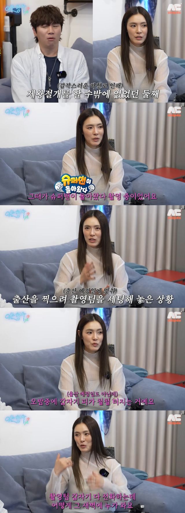 가희는 "출산 예정일에 맞춰서 세팅이 다 되어있는 상태였다"면서 "오밤중에 갑자기 피가 철철 터지더라. 너무 놀라서 샤워 타올로 감고, 촬영 팀에 갑자기 전화하는데 어떻게 그 새벽에 누가 오냐. 어쨌든 연락하고 (병원으로) 달려갔고, 촬영 팀이 갑자기 와서 분만실 들어와서 세팅했다"며 당시 급박했던 상황을 전달했다.