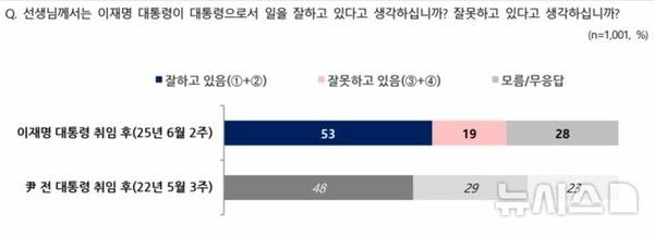 이재명 대통령의 국정수행에 대한 지지도가 53%를 기록했다는 여론조사 결과가 12일 나왔다.