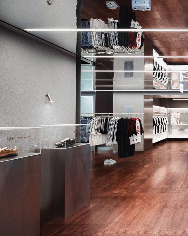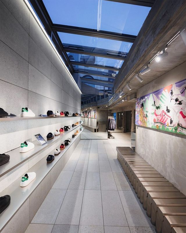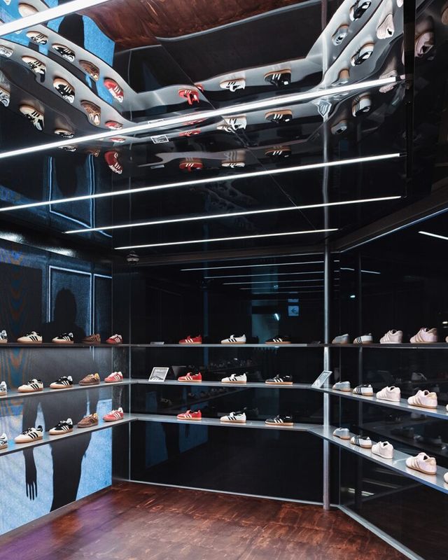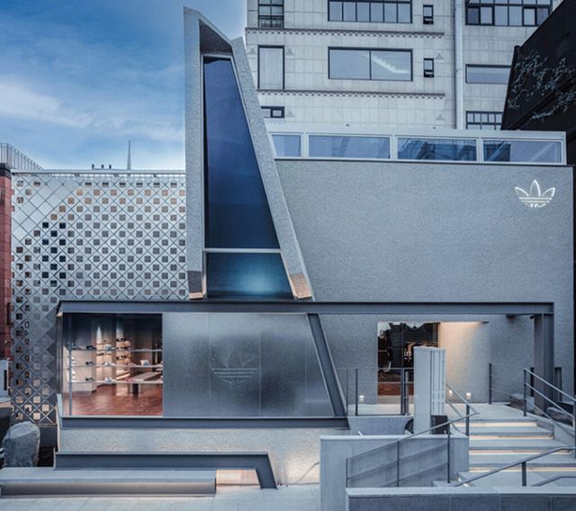아디다스 오리지널스 도산 플래그십 스토어는 기존 주거 건축물을 조형적인 리테일 공간으로 새롭게 리뉴얼한 구조가 특징입니다. 성스러운 건축물과 미래지향적 구조물을 연상시키는 실루엣을 바탕으로, 한쪽 벽면을 금속 커튼으로 감싸 강렬한 분위기를 더했습니다. 또한 입구에는 거친 자연석 오브제를 배치해 시선을 사로잡았죠. 스토어 내부는 대형 디지털 스크린과 서스펜디드 레일로 구성된 캠페인 존을 통해 시즌 별 메시지를 직관적으로 전달할 수 있도록 했습니다.