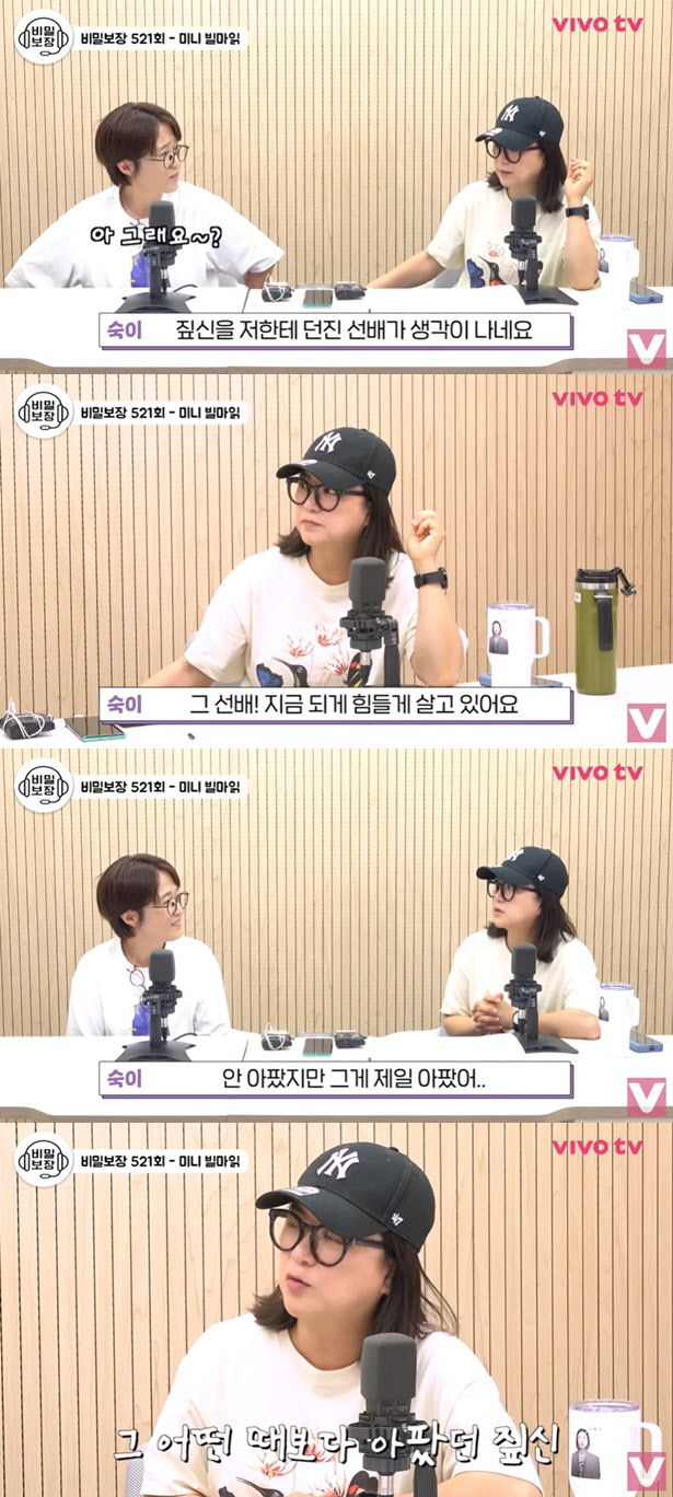 또 김숙은 과거를 회상하며 한 선배에게 맞은 적이 있다고 고백했다. 그는 “스무 살 때 KBS에 들어갔을 때 저보다 7~8살 많았던 선배가 있다. 제가 소품이었던 짚신을 잘못 가져왔다고 저한테 던진 선배가 생각난다. 그 선배 지금 힘들게 살고 있다”고 말했다.