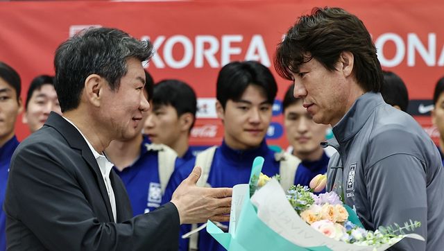 홍명보 감독이 지난 6일 이라크와 북중미 월드컵 예선경기를 마치고 인천국제공항 제1터미널을 통해 귀국하며 정몽규 대한축구협회장에게 꽃을 받고 있다. / 뉴스1