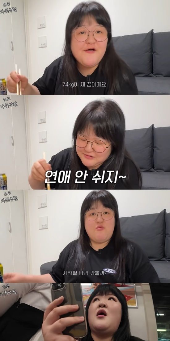 저녁에 마트에 들러 야식을 사온 이국주는 음식들을 맛보며 "74kg가 내 목표다. 내가 지금 74kg였으면 연애 안 쉰다"고 넉살을 부렸다.
