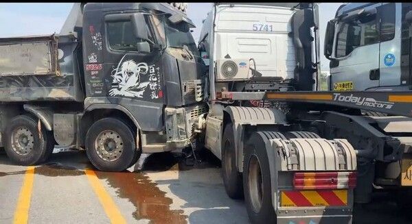 뉴시스 보도에 따르면, 운전자가 없는 상태로 전진하던 덤프트럭은 반대편 차로에서 신호대기 중이던 25t 트레일러의 측면을 추돌했다. 이어 사고 충격으로 밀린 25t 트레일러는 또 다른 덤프트럭을 들이받았다.