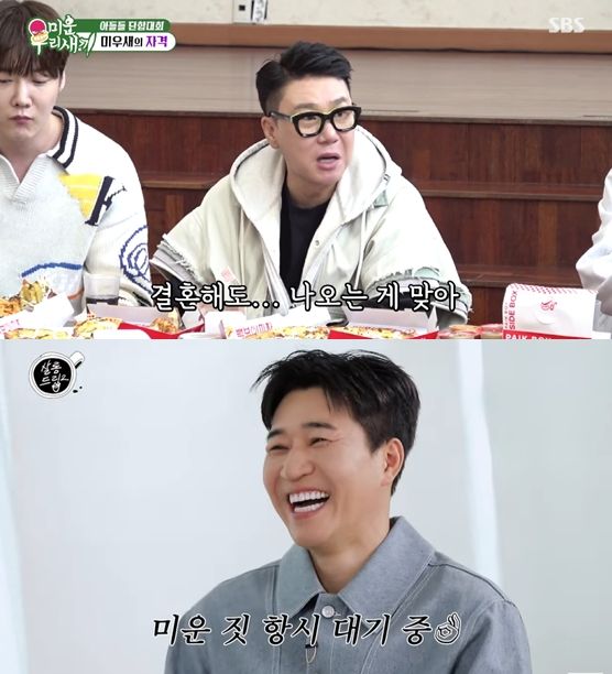탁재훈도 "결혼해서 행복하면 '미우새'가 아니다. 빠지는 게 맞다"고 거들자 김종민은 "혼인신고를 아직 안 했다"고 반박했고, 이상민 역시 "결혼해도 나오는 게 맞다"라고 편을 들었다.