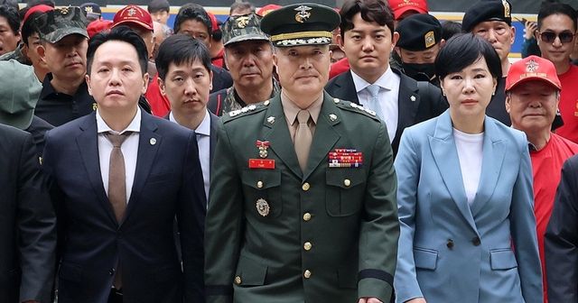 2차 공판 기일에 출석하던 박정훈 대령(가운데) / 뉴스1