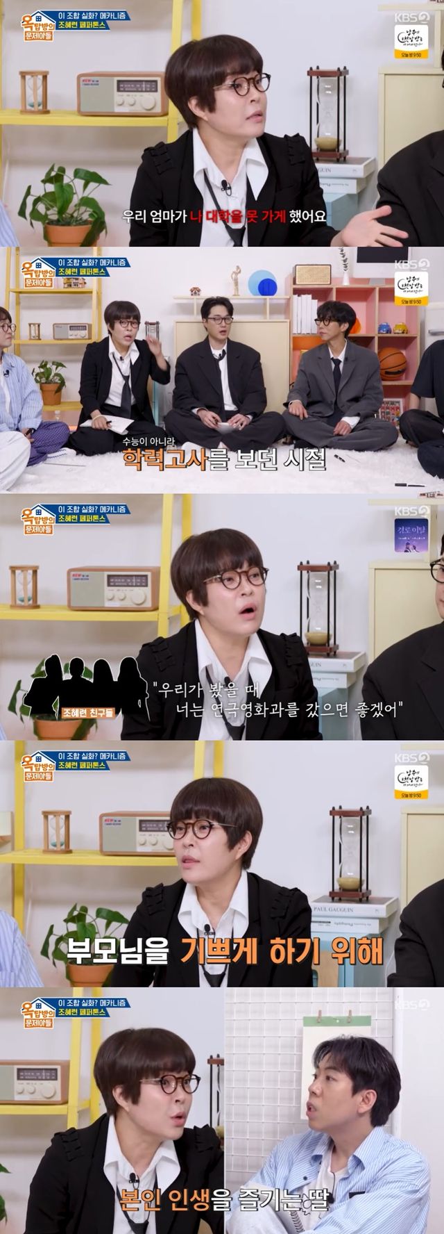 조혜련은 "화학공학과 쓴 거를 가지고 한양대에 가서 내가 연극영화과로 바꿨다"라며 좋은 성적으로 한 번에 붙었다고 전했다. 김숙은 "혜련 언니 따님도 전교 1등하고 잘하지 않냐"라며 명문 고등학교를 다녔던 딸을 이야기하자, 조혜련은 "딸이 공부를 하게 된 게 부모님을 기쁘게 하게 해주기 위해였다"라고 말했다.