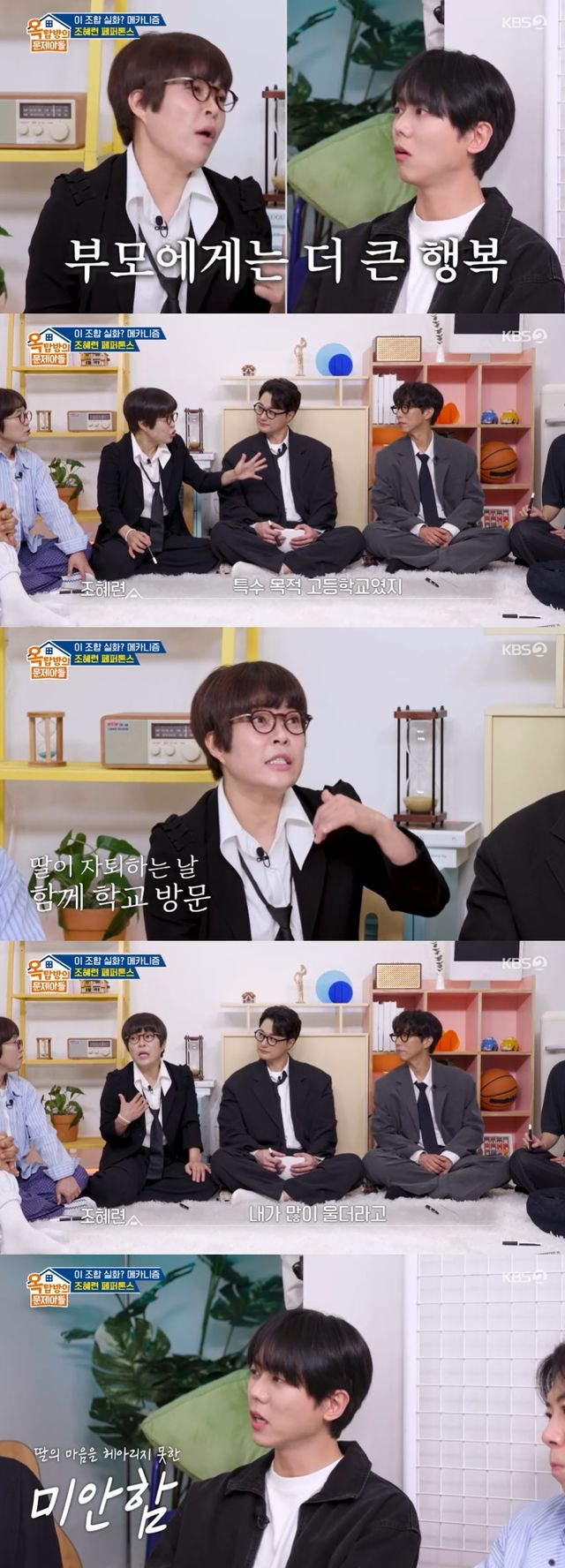 홍진경이 "(딸이) 전교 1등 놓친 적 없다가 지퇴했을때 어땠냐"라며 묻자, 조혜련은 "데리러 갈 때 내가 많이 울더라. 지금 와서 무슨 울음이었을까 생각해 보면 미안함이었던 같다. 그 아이 마음이 어땠는지 몰랐다"라고 고백했다.