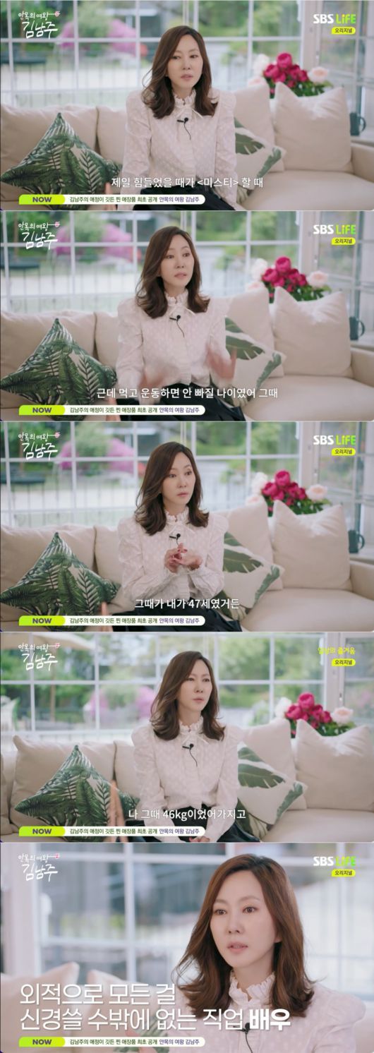 [메디먼트뉴스 김민정 기자] 배우 김남주가 SBS Life 새 예능 프로그램 '안목의 여왕 김남주'에서 드라마 '미스티' 촬영 당시 46kg까지 감량했던 혹독한 경험을 털어놓으며 시청자들을 놀라게 했다. 아름다운 모습을 유지하기 위한 그녀의 고통스러웠던 노력이 공개돼 이목을 집중시켰다.