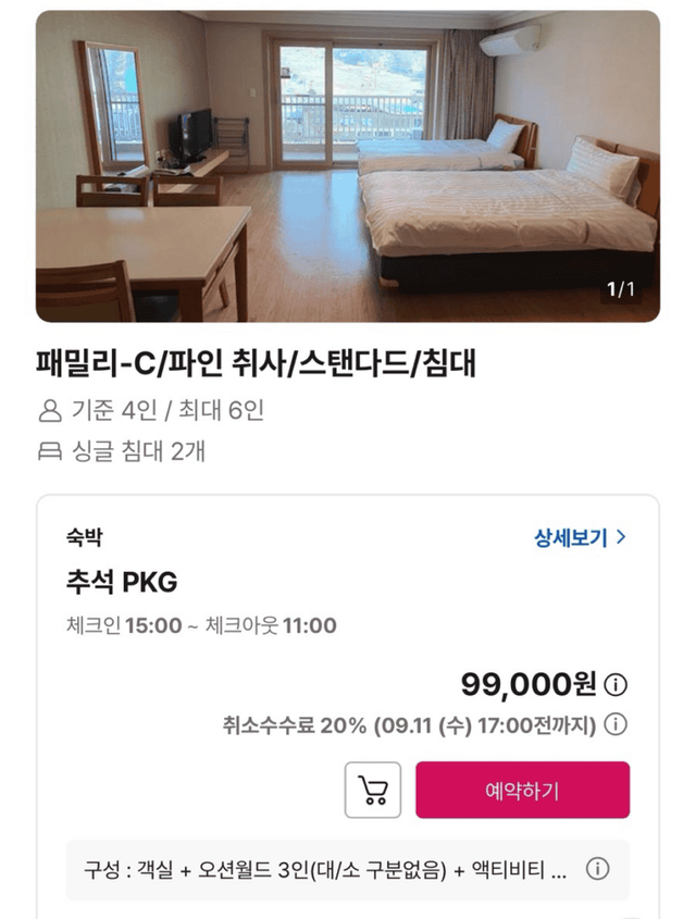 합리적인 가격과 다양한 혜택이 포함된 이번 패키지는 9월 12일, 13일, 18일, 19일, 22일에 성인 3인 기준 99,000원으로 이용할 수 있습니다. 금요일인 14일과 20일에는 109,000원으로, 여전히 높은 가성비를 제공합니다.