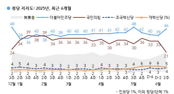 이날 여론조사 기관인 한국갤럽이 지난 10일부터 12일까지 양일간 전국 만 18세 이상 남녀를 대상으로 조사한 결과 민주당이 46%의 지지도를 얻으면서 국민의힘(21%)보다 25%포인트(p) 앞서며 두 배 이상 격차를 벌렸다. 개혁신당은 5%의 지지율을 얻었다.