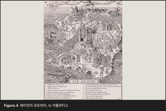 더 나아가 베이컨은 국가와 사회가 지원하는 공동 연구의 필요성을 이야기합니다. 베이컨의 저서 『새로운 아틀란티스』(1626)에는 솔로몬의 집이라는 공간이 등장하는데요. 이곳에는 36명의 연구원이 분업하여 연구합니다. 외국을 여행하며 정보를 수집하는 사람, 실험을 수집하는 사람, 실험을 수행하는 사람, 수집된 내용을 정리하는 사람, 실용적으로 응용할 방법을 찾아내는 사람, 새로운 실험을 연역하는 사람, 새로운 실험을 수행하는 사람, 이를 모두 취합하여 자연법칙을 이끌어내는 사람으로 나뉘어 합동 연구를 진행합니다.