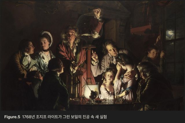 이에 대해 보일은 새를 넣은 유리구 속에 작은 깃털 하나를 매달은 채로 진공을 만들었습니다. 홉스의 말대로 공기의 강한 소용돌이가 새를 죽인 것이었다면 깃털은 소용돌이 때문에 요동을 쳤을 테지만 미동도 하지 않았죠.