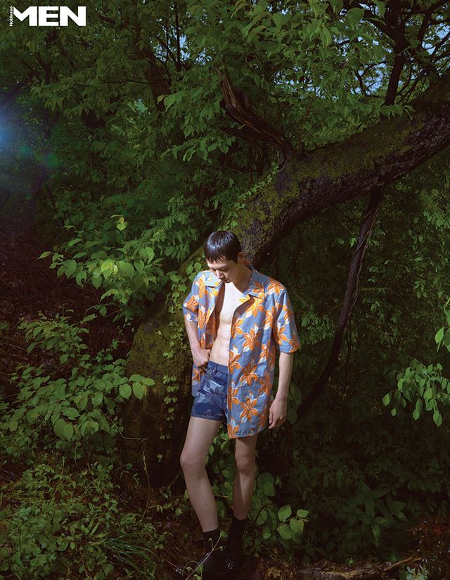 하와이안 셔츠와 플라워 자수 데님 쇼츠 모두 Gucci, 스터드 장식 로퍼 Bally, 양말 에디터 소장품.