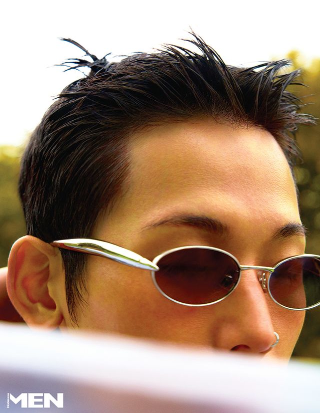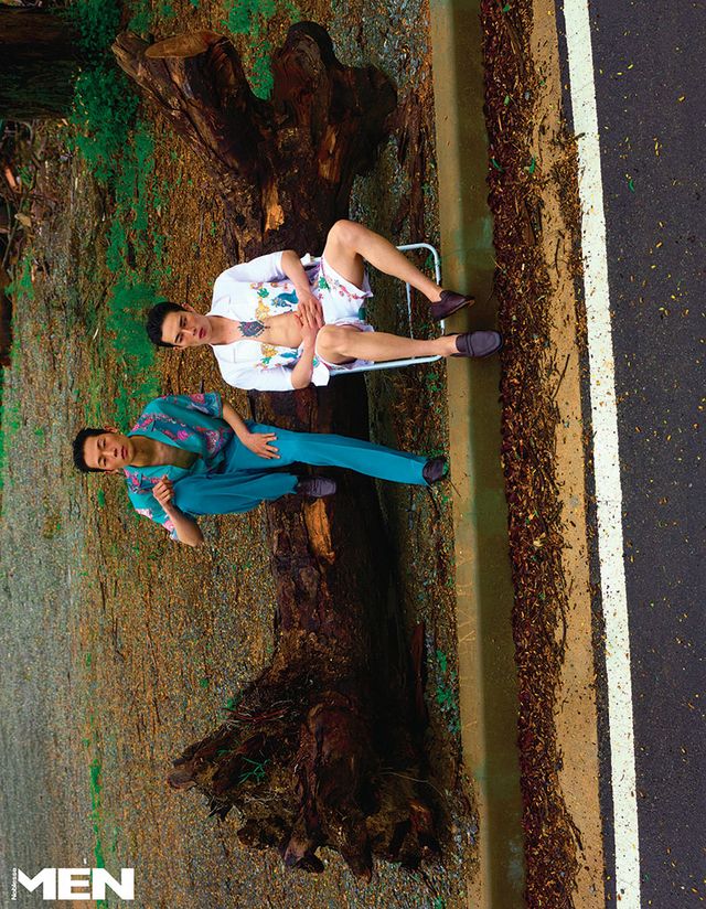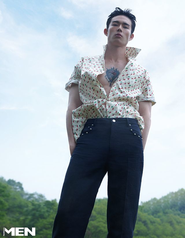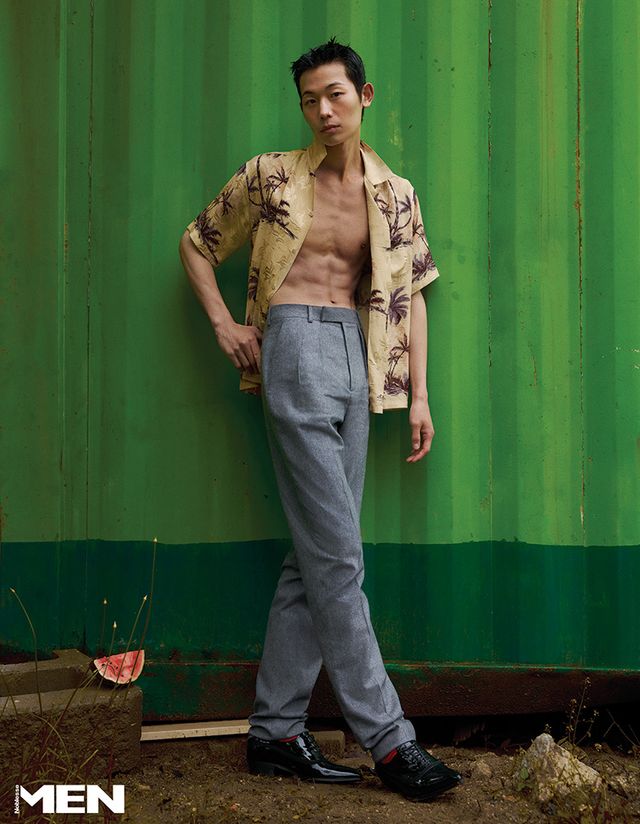 민석 _ 산호・조개・인어 프린트 실크 셔츠와 팬츠 모두 Versace, 브라운 로퍼 Prada.