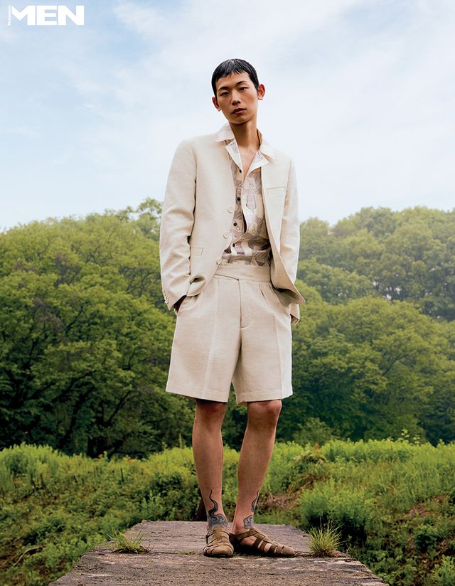 리넨 재킷과 칵테일 프린트 실크 셔츠, 버뮤다팬츠, 스웨이드 피셔맨 샌들 모두 Loro Piana.
