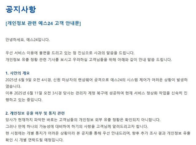 예스24는 지난 12일 홈페이지에 게시한 고객 안내문서 “현재까지 파악한 바로는 고객들의 개인정보 외부 유출 정황은 확인되지 않았다”면서도 “추가 조사 결과 개인정보 유출 확인 시 개별 연락 예정”이라고 밝혔다.