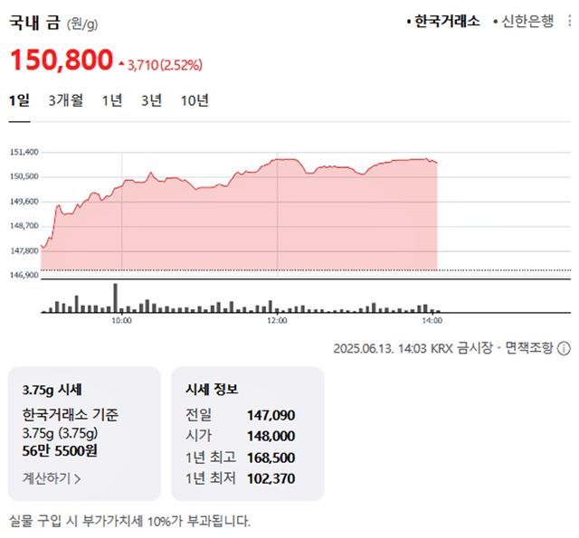 국내 금시세(금값)가 13일(한국 시각) 오후 상승세(전 거래일 대비)를 보이고 있다.