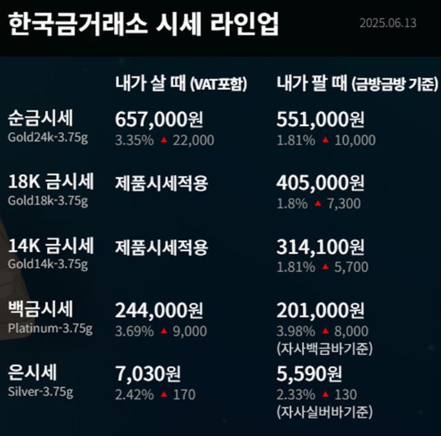 순금(24K) : 매입가 65만 7000원 / 매도가 55만 1000원