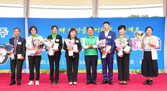 강기정 광주광역시장이 12일 오전 남구 효천물빛노닐터에서 열린 ‘제15회 새마을의 날 기념식’에 참석해 조인철 의원, 김병내 남구청장 등 내빈들과 퍼포먼스를 하고 있다.