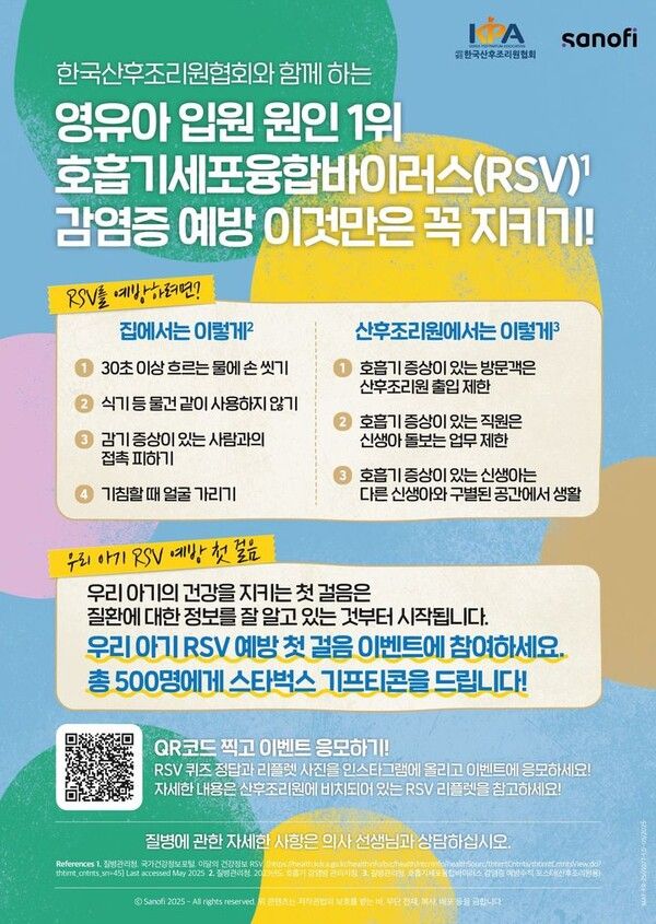 글로벌 헬스케어 기업 사노피 한국법인이 한국산후조리원협회와 함께 호흡기 세포융합 바이러스(RSV) 감염 예방에 대한 인식을 높이기 위해 캠페인을 진행한다.