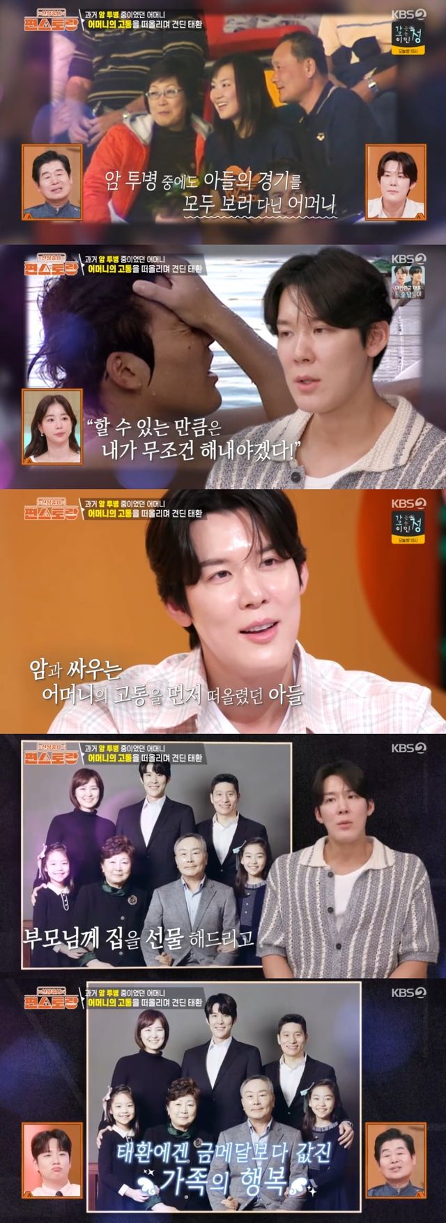 박태환은 어마어마한 기록으로 대한민국 수영의 신화를 썼는데, 박태환은 "어머니가 저 어렸을때 암 투병하시고 힘드셨다. 수영이란 종목을 해서 끝을 봐서 '대한민국 1등' 이런 게 아니라 '우리 엄마를 위해서, 아빠를 위해서 할 수 있는 만큼은 내가 무조건 해야겠다 했다'"라고 말했다.