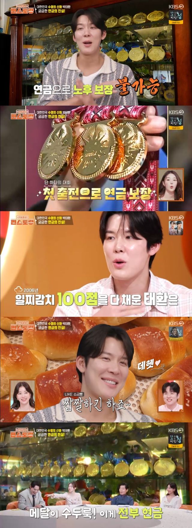 특히 박태환은 "100점 채우면 평생동안 연금이 나오는데 저는 점수가 차 있으니까, 그다음부터 국제대회 나가서 딴 점수는 현금으로 일시불로 나온다. 포상금을 딸 때마다 받는다"라고 전했다.
