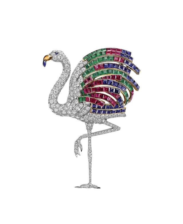 1940년, 윈저 공작은 아내의 44번째 생일을 위해 또 하나의 걸작을 투상에게 의뢰한다. 바로 플라밍고 브로치다. 파리에 보관된 까르띠에 장부에 따르면 공작은 같은 해 3월 루비 42개, 사파이어 42개, 에메랄드 42개, 다이아몬드 102개를 제공했다. 이 다채로운 보석은 플라밍고의 무지갯빛 깃털, 부리, 눈, 움직일 수 있는 다리로 재탄생했다. 한편 5월 말 공작이 완성품을 수령했을 무렵, 독일군이 프랑스를 침공해 파리로 진격하는 중이었다. 런던에서는 멀어진 동생 국왕 조지 6세가 영국 정보기관의 보고를 받았는데, 그 보고서에는 윈저 부부가 친나치 성향을 가졌으며 독일이 영국을 침공할 경우 왕위에 복귀할 수도 있다는 내용이 담겨 있었다. 이러한 상황에서 윈저 부부는 영국 총리로 지냈던 윈스턴 처칠(Winston Churchill)에 의해 유럽에서 멀리 떨어진 카브리 제도 바하마로 파견된다. 공작은 총독으로 임명됐고, 공작부인은 열대의 땅에 걸맞은 플라밍고 브로치를 착용했다. 85년이 지난 지금, 이 화려한 새는 여왕들과 공주들이 착용했던 보석과 함께 전시회에서 대중에게 공개된다.