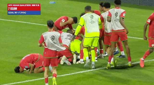 월드컵 예선 후반 추가시간 페널티킥으로 동점 골을 넣고 기뻐하는 오만 선수들 모습 / AFC 홈페이지