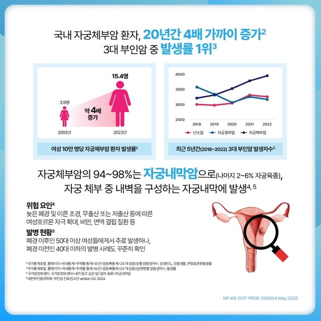 자궁체부암발병률은 2002년여성 10만명당 3.9명에서 2022년 15.4명으로 20년사이약 4배로증가했으며, 특히 2020년대들어서는 3대부인암중매년가장많은발생자수를보이고있다.