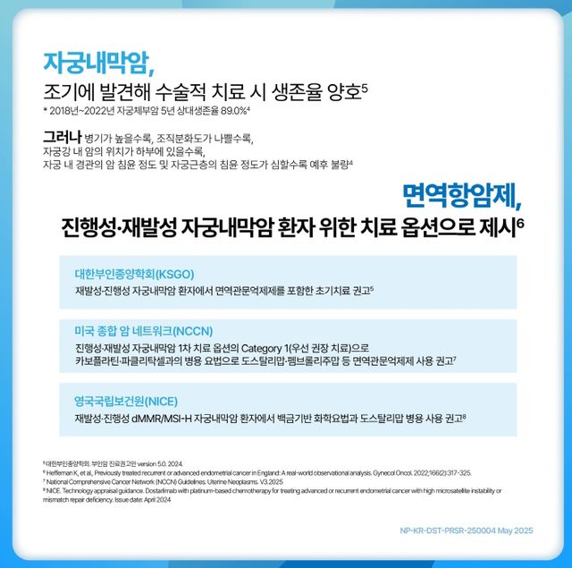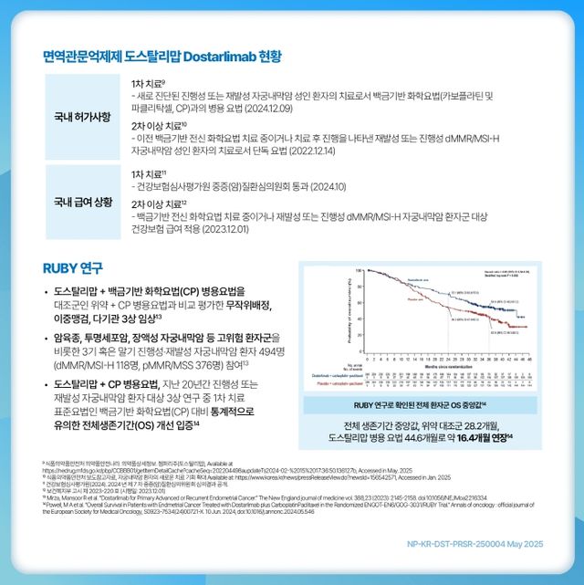 이듬해인 2024년 3월에는백금기반화학요법(CP)과의병용요법으로진행성또는재발성 dMMR/MSI-H 자궁내막암성인환자의치료제로승인됐으며, 같은해 12월 MMRp/MSS 종양이있는환자의 1차치료를대상으로도적응증을추가승인받아자궁내막암 1·2차치료모두에서허가받은면역항암제가됐다.