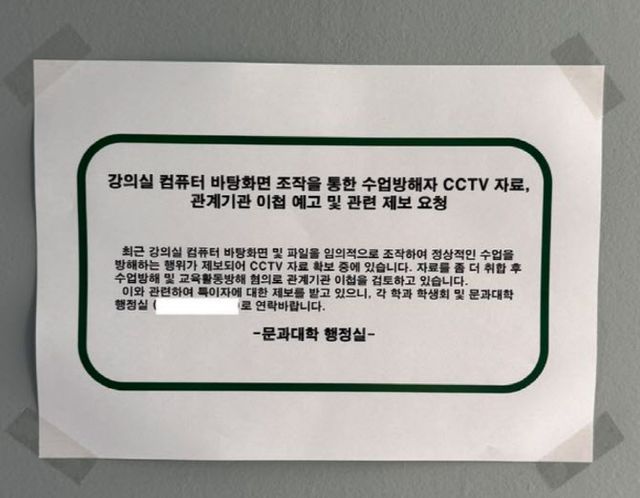 논란이 확산되자 학교 차원에서 조처에 나섰다. 문과대 행정실은 최근 “강의실 컴퓨터 바탕화면 및 파일을 임의로 조작해 정상적인 수업을 방해하는 행위가 제보돼 폐쇄회로(CC)TV 자료를 확보 중”이라며 “자료를 취합해 수업방해 및 교육활동방해 혐의로 관계기관 이첩을 검토하고 있다”는 안내문을 부착했다. 안내문 부착 이후에는 유사한 사례가 더 이상 발생하지 않은 것으로 확인됐다.