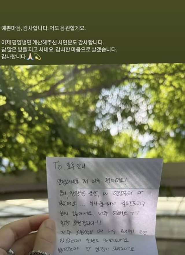 한효주는 지난 14일 자신의 개인 인스타그램 스토리를 통해 “예쁜 마음, 감사합니다. 저도 응원할게요”라는 메시지와 함께 한 장의 손편지 사진을 공개했다.