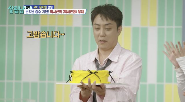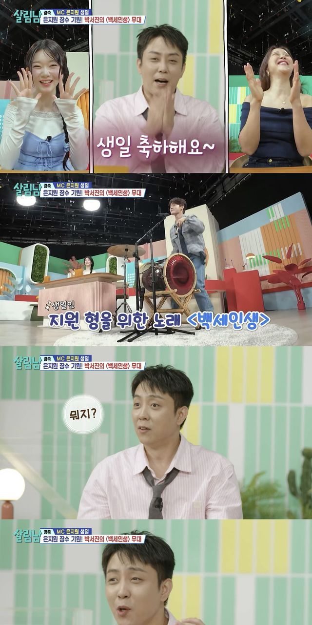 '살림남' MC로 활약 중인 은지원은 이날 생일을 맞아 제작진, 출연진, 팬들에게 축하를 받았다. 은지원은 '백세인생' 가사를 듣다 "가사가 뭐 이래?", "이거 먹이는 노래 아니야?"라고 물으면서도 박서진의 노래를 즐겼다.