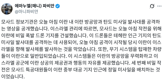 이번 이란 내 지휘부 및 방공망 제거 작전에 대해 모사드가 슬슬 정보를 풀고 있네요.