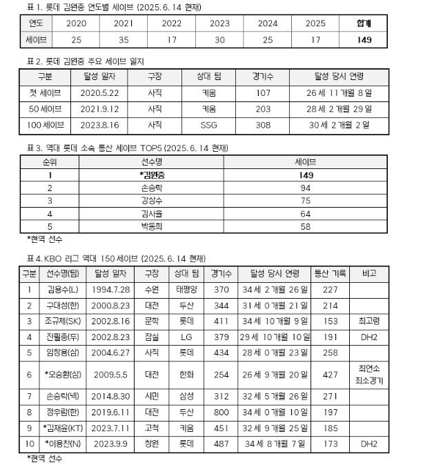 김원중은 14일 인천 SSG 랜더스전에서 팀의 마지막 투수로 등판해 1이닝을 막아내며 올 시즌 17번째 세이브를 기록했다. 이로써 개인 통산 149세이브를 기록하며 역대 11번째 150세이브 달성까지 단 1개만을 남겨두게 되었다. 2015년 입단 이래 롯데에서만 활약하며 롯데 구단 최다 세이브 기록을 보유하고 있는 김원중은 롯데 구단 최초 150세이브라는 또 하나의 이정표를 세우게 된다.