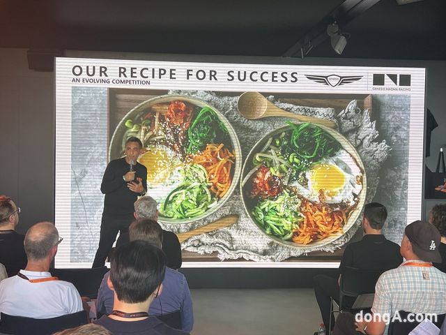 시릴 아비테불 현대모터스포츠법인장 겸 GMR 총감독이 제네시스마그마레이싱 ‘비빔밥 전략’을 소개하고 있다. 비빔밥처럼 최적 요소를 조합해 가장 한국적인 모터스포츠 브랜드로 육성한다는 취지다.