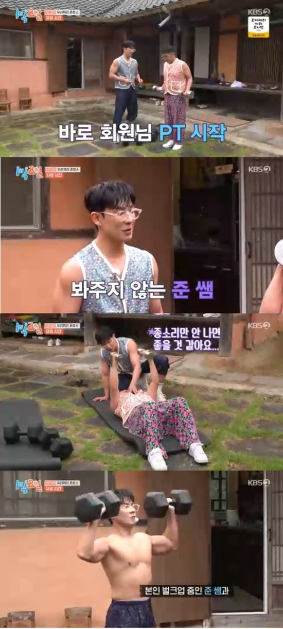 멤버들은 각자 자유시간을 가졌다. 이준은 머슬핏의 촌캉스 조끼 자태를 뽐내며 등장해 아령을 들어올리며 운동을 했다.