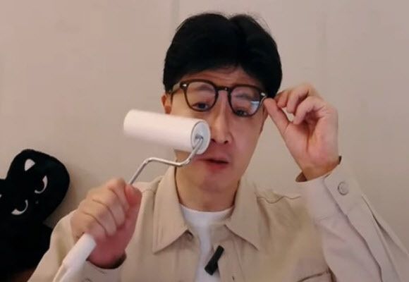그는 라방에서 옷과 담요 등에 달라붙은 애완동물의 털을 제거할 때 쓰는 돌돌이를 꺼내 자기 얼굴에 사용하는 모습을 연출했다.