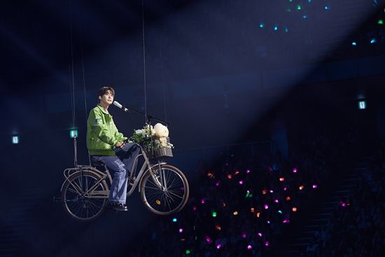 도영은 "오늘 모니터 하느라 (자전거를 탄) 사진을 봤는데 엄청 무서워보이더라. 걱정할 수도 있겠다는 생각을 했다. 하지만 처음에 리허설하느라 탔을 때도 안 무서워서 놀랐다. 오히려 자전거 높이를 더 올리라고 했다"며 "3층 관객들을 위한 이벤트이기도 하다. 실체 특성상 천장이 높다고 하더라. 자전거 연출 시야만큼은 3층이 제일 좋았을 거다"라고 설명했다.
