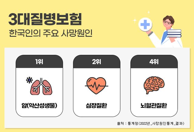 [파이낸셜경제=김예빈 기자] 흔히 3대질병이라 일컫는 암, 심혈관질환, 뇌혈관질환은 통계청 발표자료에 따르면 한국인의 주요 사망원인 중에서 3위 폐렴을 제외하고 1~4위를 차지하고 있으며, 이전부터 지금까지도 살면서 가장 먼저 대비해야 하는 치명적인 질병으로 강조되고 있다. 이러한 중대질병에 대비하기 위하여 상기 세가지 치명적인 질병을 집중보장하는 3대질병진단비보험을 많이 가입하고 있다. 3대진단비보험은 각각의 질병을 중점적으로 보장하면서도 가입자 특성에 맞는 특약을 추가함으로써 종합건강보험으로도 활용할 수가 있다.