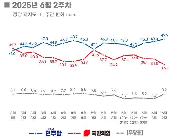 [폴리뉴스 김승훈 기자] 더불어민주당 지지율은 1.9%P 상승(48.0%→49.9%)하고 국민의힘은 4.4%P 하락(34.8%→30.4%)하면서 양당 격차가 29.5%P까지 벌어진 것으로 나타났다.