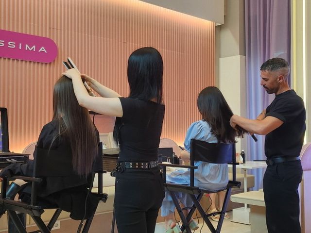 이탈리아 헤어 스타일리스트 지오바니 요비노(오른쪽)와 위닛헤어의 여민 헤어 디자이너가 참석자들의 헤어 스타일을 연출해주고 있다. = 추민선 기자